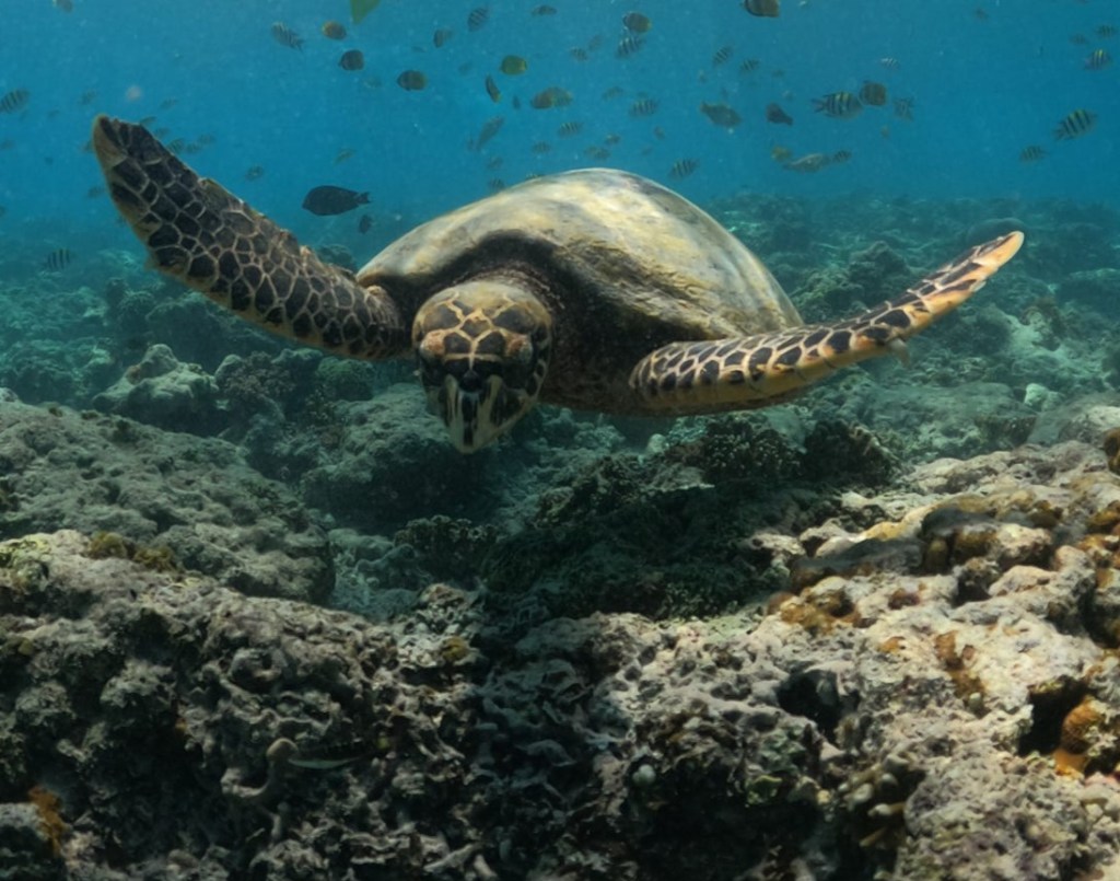 At Turtle Point on Gili T, I was already swimming away from the reef disappointed, having admired hundreds of colorful fish but no turtles when suddenly in waist-deep water, two giant sea turtles appeared right in front of me. Not just one, but two! One swam off, leaving me with the smaller oneas I later realized. It was grazing on seagrass. I watched from a respectful distance so as not to disturb it. On each side of its shell were three curly white markings, perhaps it was a female.