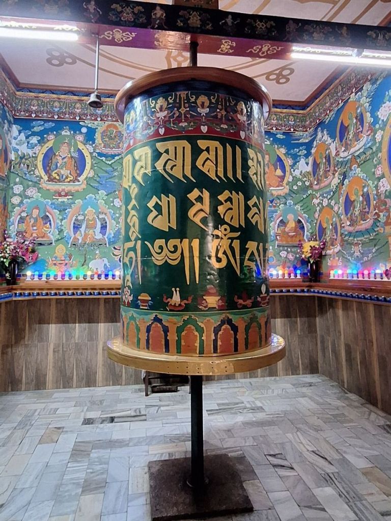 Temples, stupas and sacred sites are surrounded by prayer wheels. These cylindrical forms also contain mantras and prayers. A larger prayer wheel should be walked around and spun three times in honor of the present, the past and the future.